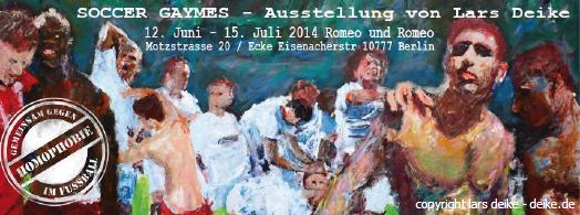 Ausstellung zum CSD Berlin 2014 und zur ganzen Fußball Weltmeisterschaft vom 12. Juni bis zum 15 Juli 2014 ist die Ausstellung in der Motzstraße 20 10777 geöffnet. Zu grossen Spielen wird Ufuk von Romeo und Romeo ein Gay-Public Viewing machen. Zum CSD am 21. Juli dieseen Samstag wird die CSD Bühne (Abschlußkundgebung und Feier / Party) direkt gegenüber von unserer Ausstellung in der Motzstrasse sein - besucht uns!