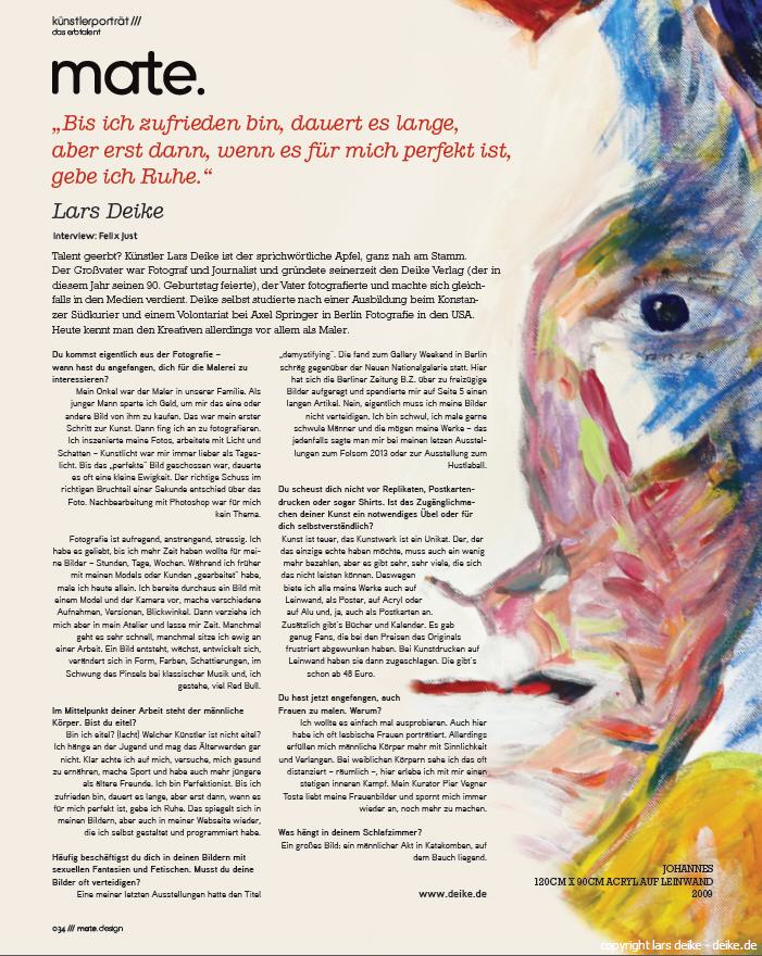 Inherited talent? Artist Lars Deike is the proverbial apple, close to the trunk. The grandfather was a photographer and journalist and founded at the time the Deike publisher ( who celebrated his 90th birthday this year ), the father photographed and made likewise deserves in the media. Deike himself studied after training at Constance Südkurier and an internship at Axel Springer in Berlin photography in the United States. Today, however, knows the creatives primarily as a painter.