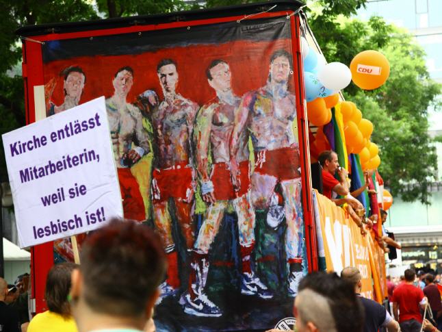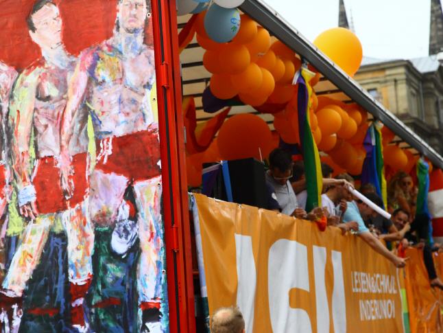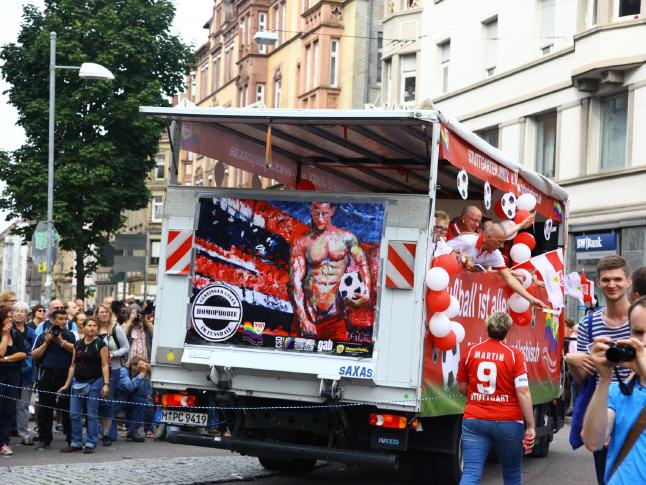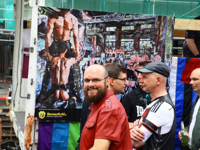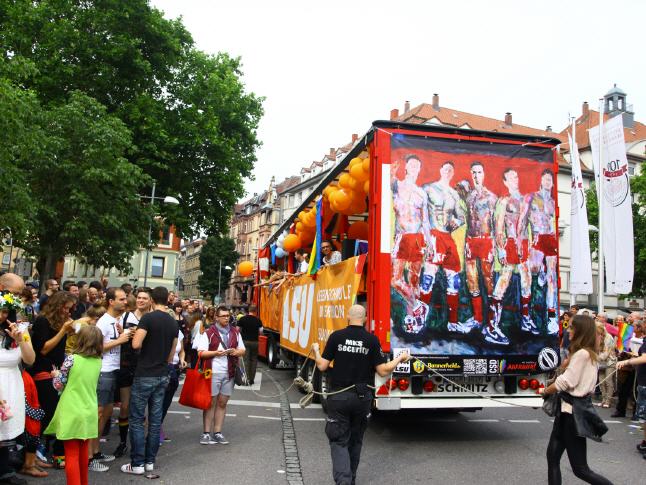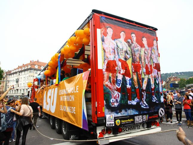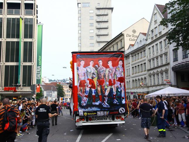 ENGLISH below AUFRUHR! - Gemeinsam gegen Homophobie - Lars Deike unterstützte die Aktion zum Stuttgarter CSD auf 4 CSD Wagen: LSU - die schwule Gruppe der CDU, Stuttgarter JUNXX - schwuler Fussballverein in Stuttgart, LC Stuttgart, Suttgarter Lederclub, CSD Stuttgart e.V. und die offiziellen CSD Partys - Lovepop, Lehmanns, Gaydelight, u.a. Verschiedene Gemälde von Lars Deike wurdn auch 3 x 2 Meter-Bannern auf den verschiedenen CSD Trucks gezeigt. Ein voller Erfolg. Danke Stuttgart. Hoffentlich haben wir viele mit diesem Thema angeregt, aufgeregt und zum nachdenken veranlasst. 230.000 Besucher jubelten den Wagen zu. Der Zug setzt sich in diesem Jahr aus insgesamt 67 Formationen – Fuß- und Motorradgruppen, PKWs und LKWs – mit etwa 3.500 aktiven Teilnehmerinnen und Teilnehmern zusammen. Details darüber, welche Gruppen, Initiativen, Projekte, Institutionen oder Unternehmungen am 26.07. Flagge zeigen. ie bewährte Paradestrecke führt von der Böblinger Straße im Stuttgarter Süden über den Marienplatz, die Tübinger Straße, die Eberhardstraße, die Markt- und Münzstraße zum Karlsplatz. Der Demo-Lindwurm findet mit Redebeiträgen im Rahmen einer großen Kundgebung auf dem Schlossplatz seinen Schlusspunkt.