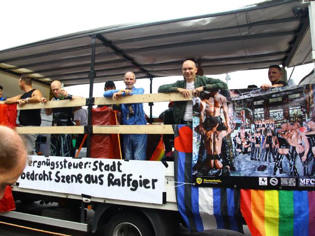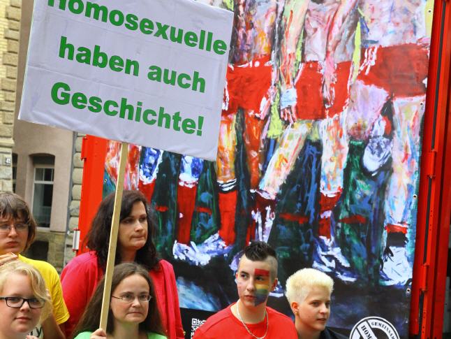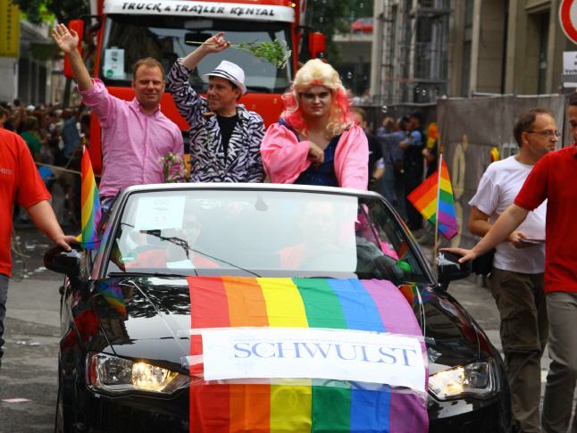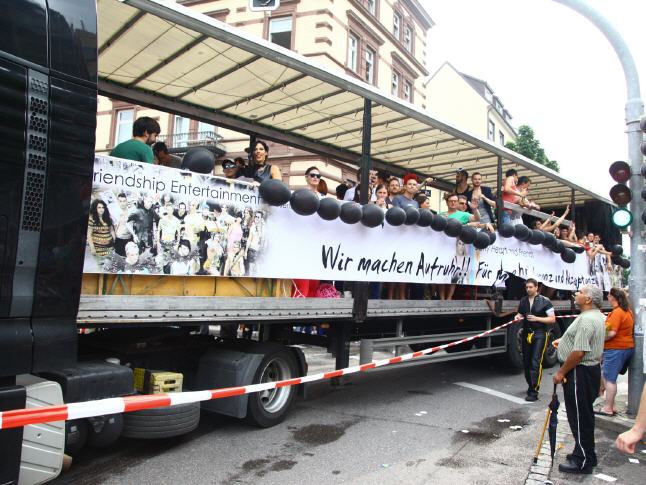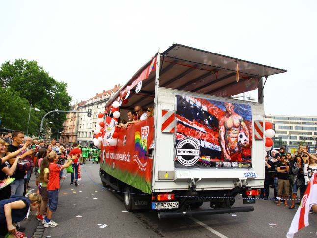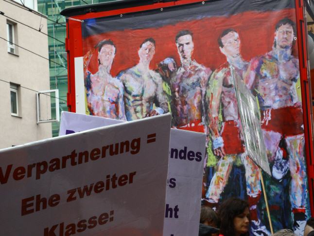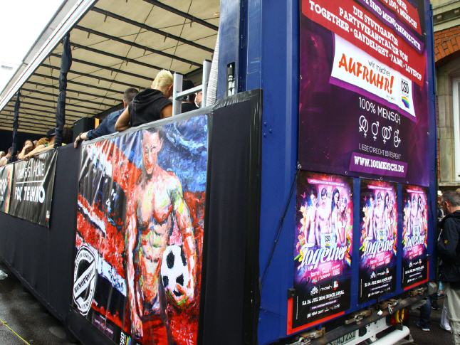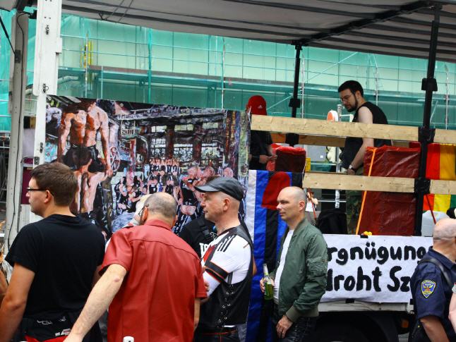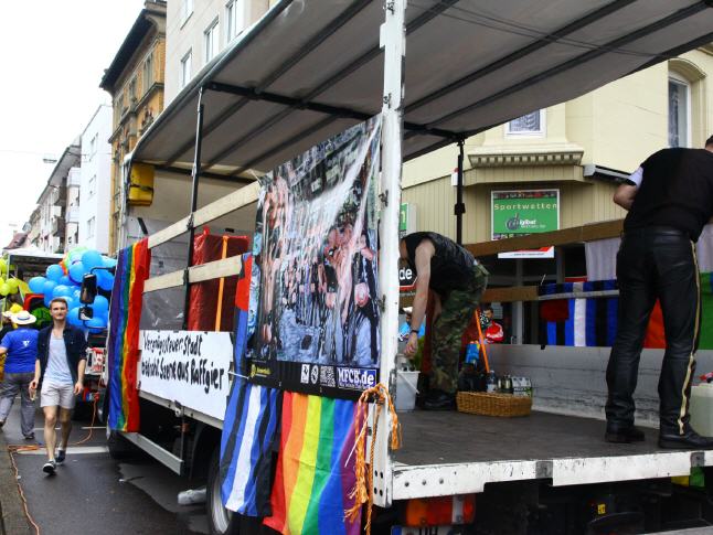 ENGLISH VERSION: REVOLT! - Together against Homophobia - Lars Deike supported the action to Stuttgart CSD on 4 CSD Cart: LSU - the gay group of the CDU, Stuttgart Junxx - gay football club in Stuttgart, LC Stuttgart, Suttgarter leather club, CSD Stuttgart eV and the official CSD parties - Lovepop , Lehmann, Gaydelight, including Several paintings by Lars Deike wurdn also 3 x 2 meter banners on different CSD Trucks shown. A complete success. Thank Stuttgart. Hopefully we have many excited with this topic, excited and caused to think. 230,000 visitors cheered the car. The train continues in this year a total of 67 formations - Foot and motorcycle groups, cars and trucks - with about 3,500 active participants together. Details about which groups, initiatives, projects, institutions or enterprises at 26.07. Flag show. ie proven parade route leads from the street to the south of Stuttgart Böblingen on the Marienplatz, the Tübingen road, the road Eberhard, the market and Münzstraße to Karlsplatz. The demonstration dragon found with speeches at a large rally at the Schlossplatz its final point.