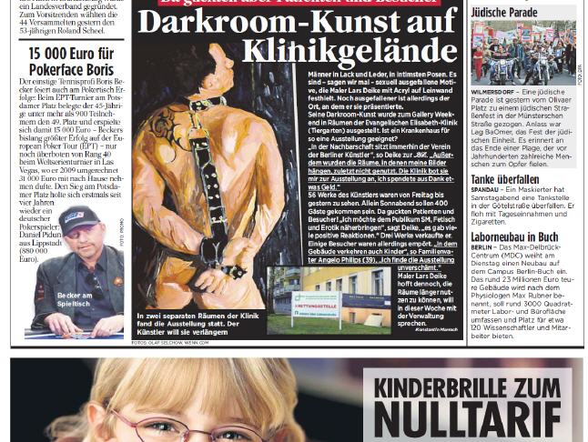 26.04.2013: 26.04.2013: Gallery Weekend Berlin 26.04.-28.04.2013 - Ausstellung "Demystifying" - "Entmystifizierung" - aufregende Fetisch - Motive - was Du schon immer über Fetisch, Erotic und Sex wissen wolltest - Kurator: Pier Vegner Tosta - Ort: Berlin Schöneberger Ufer 69. 10785 Berlin - ca. 200 Meter zur Neuen National Galerie, direkt zwischen den Galerien Aurel Scheibler und der Galerie Esther Schipper und dem Verein Berliner Künstler. - Persönliche Einladung und mehr Infos über Facebook: Lars Deike Paintings (https://www.facebook.com/events/510530182339346/) Du kannst nicht kommen? Dann findest du die komplette Ausstellung ind 3-D hier auf meiner Seite Gemälde - unter "Kunst-Ausstellung 3-D - diese wird ab dem 27.April freigeschaltet! Großer Bericht der B.Z. (größte Zeitung Berlins) Berliner Zeitung auf Seite 5 - siehe auch unter Presse oder den kompletten Artikel hier Die Ausstellung in 3-D findest Du hier! |